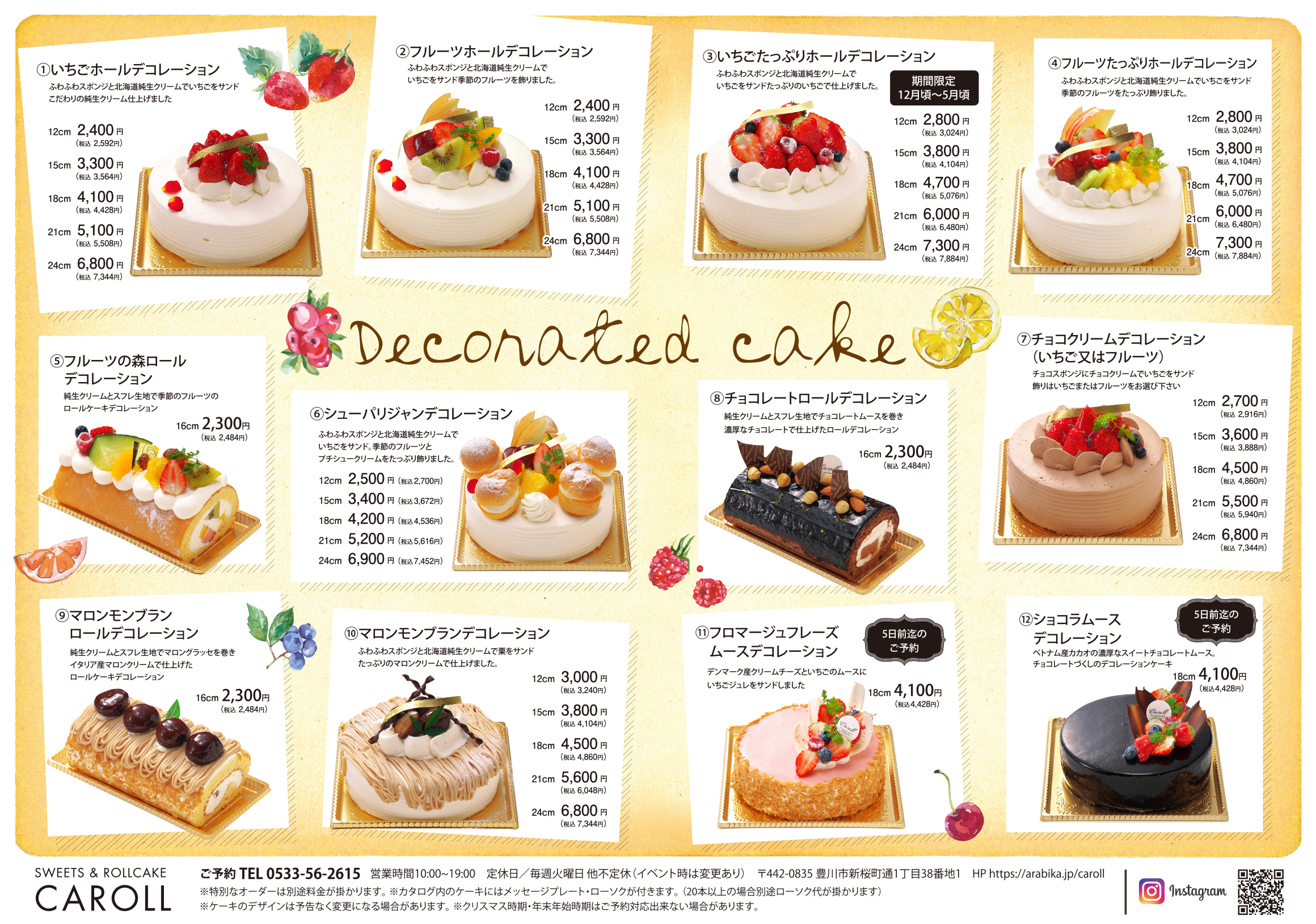 ロールケーキから始まった洋菓子店 我流で始まった菓子造り。店名でもあるロールケーキから始まりました。 試行錯誤を繰り返し、お客様からお叱りやお褒めのことばをたくさん頂きました。 これからも末永くあるためにスタッフ一同、力を合わせて頑張っていきます。 Instagram/sweets_rollcake_caroll おはようございます😊 本日お休み頂 さらに読み込む Instagram でフォロー メニュー 一覧 〜 Cakes 〜 ロールケーキは看板商品「純生キャロール」のほか、季節の果物を使ったロールケーキをそろえています。 プチ・ガトーは定番のモンブランやショートケーキのほか、季節の果物を使ったタルトやケーキが人気です。 豊川ブッセやクッキーなどの焼き菓子はご家庭のおやつはもちろん手土産としてもお使いいただけます。 季節の商品を中心にインスタグラムでお知らせしていますのでフォローをお願いします! 〜 和みのショコラ「栗きんとんショコラ」 〜 販売時期:9月~3月 秋の味覚の代表格の栗。当店では四国伊予栗を和菓子の「栗きんとん」にし、洋菓子の「トリュフチョコレート」と融合させた、話題のハイブリットスイーツが、パティシエの確かな技術によって誕生しました。 厳選された食材「伊予」の栗。それを覆うチョコレートは、イタリアンパティスリーアカデミーペストリーシェフ達によるブラインドテイスティングでワールドベストミルクチョコレート金賞受賞したカルマクレアチョレートを使用しました。 数あるミルクチョコレートの中でもカカオ豆は、エクアドル産アリバカカオ・ジャバ産カカオ配合により、強い個性を持ったキャラメル風味でまろやかなチョコレートです。 しっかりとした栗本来の旨味、カカオのコクとそのフルーティさ、エキゾチックなハーブやスパイスの香りがほのかに漂う、たっぷりのクリーミー感とミルクがあふれる調和の取れた新しいショコラを是非、お楽しみ下さい。 〜デコレーションケーキ〜 〜 Christmas Cake 〜 〜 お絵かき DECO 〜 ご予約は5営業日前までに、店頭でのみ受付しております。 また、1日に出来る数に限りがあり、ご予約希望日に受付出来ない場合がございますので、お早目のご予約をお勧めいたします。 ご予約の際は見本となるイラストや写真をはがきサイズくらいの大きさでお持ちください。 写真の場合はできるだけピントが合っているお写真をご用意ください。 お客様にお持ちいただいたいたイラスト等を確認し、簡単な打ち合わせをしたうえでご予約を受け付けさせていただきます。電話等での事前予約は受けかねますので、ご了承ください。 ケーキなどご予約はコチラ お早めにご予約ください。 Tel.0533-56-2615 店舗情報 Sweets & Rollcake CAROLL 愛知県豊川市新桜町通1-38-1 TEL: 0533-56-2615 営業時間/AM10:00~PM19:30 火曜定休(祝日・イベント時は営業)